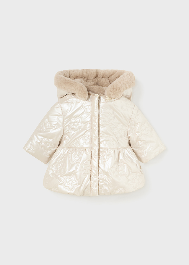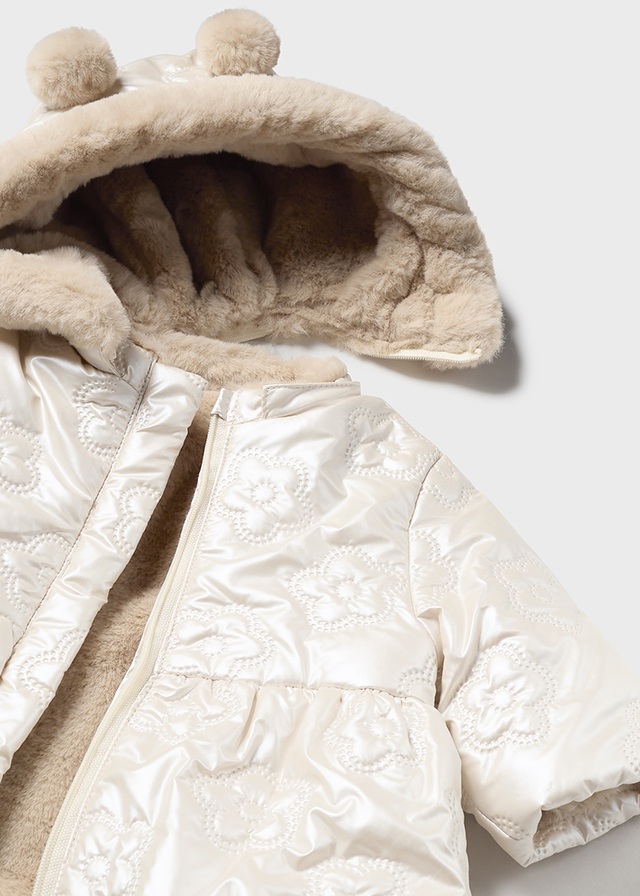 • Πολυτελές μπουφάν διπλής όψης , με μαλακή μπεζ γούνα και κομψές μπεζ-χρυσές αποχρώσεις. Διαθέτει αποσπώμενη κουκούλα με χαριτωμένα αυτάκια, προσφέροντας ζεστασιά και στυλ στο μικρό σας. Ιδανικό για να προστατεύει το μωρό σας από το κρύο, ενώ παραμένει άνετο και μοντέρνο.
