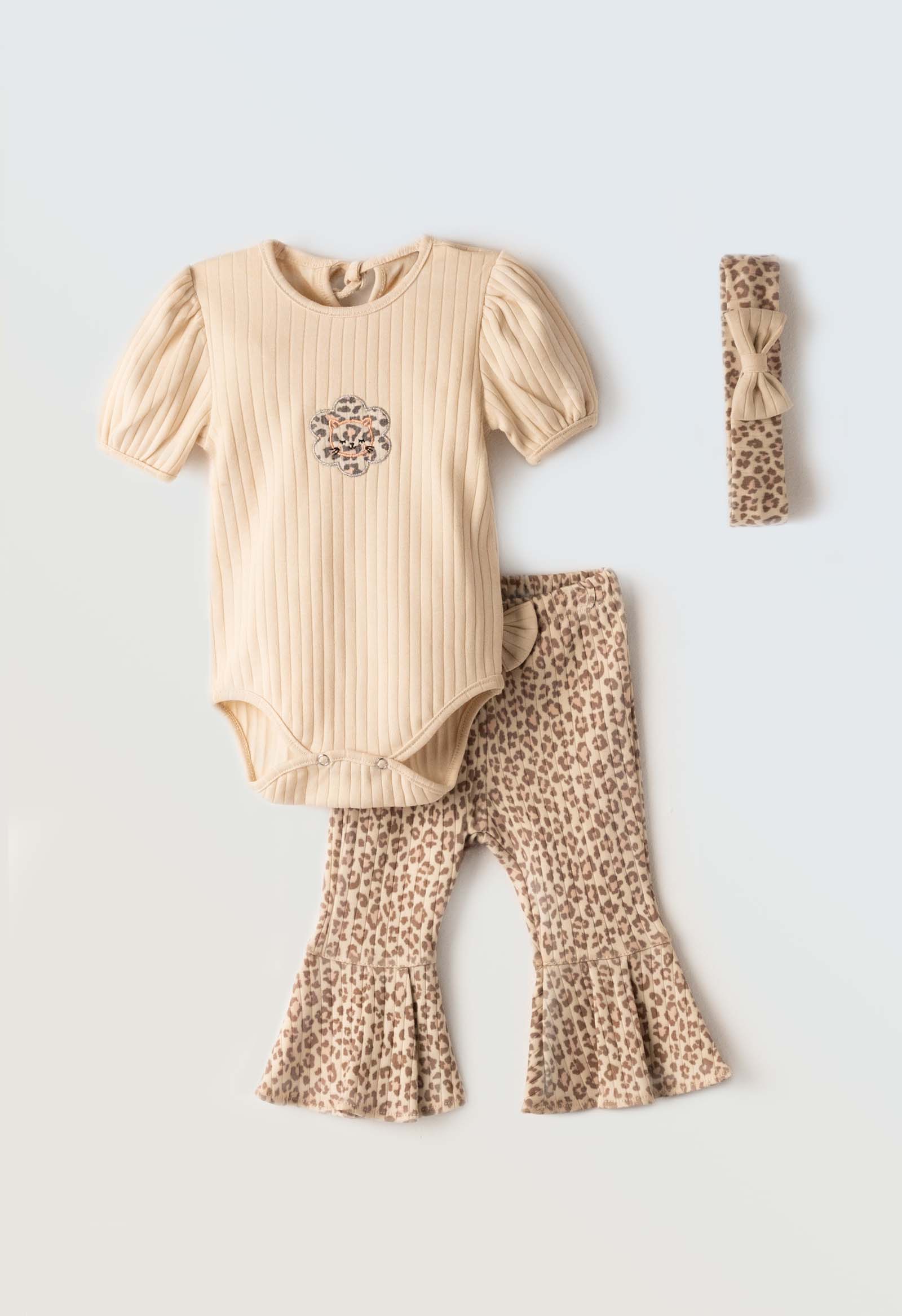 - Το σετ περιλαμβάνει κοντομάνικο ζιπουνάκι, μακό παντελόνα καμπάνα και κορδέλα