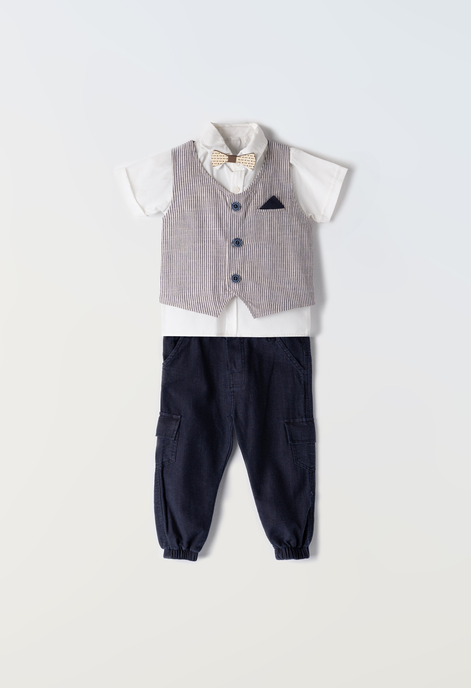 - Το σετ περιλαμβάνει μακρύ παντελόνι με αυξομείωση μέσης και ζώνη, κοντομάνικο πουκάμισο με παπιγιόν και ριγέ γιλέκο με τσέπη