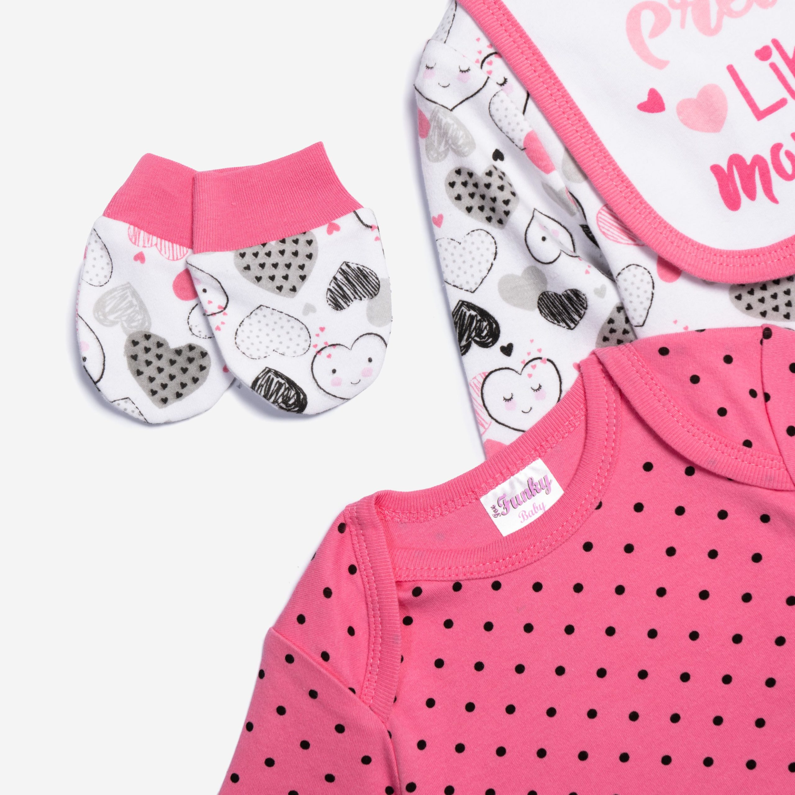 • Σετ 8τεμάχια φορμάκι, κορμάκι, σαλιάρα, σκουφάκι, γαντάκια και τρία πετσετάκια